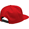 Six panel, flat bill, snapback cap with arched front, peforated back and woven patch