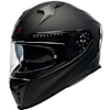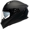 Full-face motorcycle helmet with internal sun visor, removable nose cap, and micrometric buckle closure
