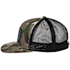 Snap-back trucker cap with flat bill, structured crown, twill main front, poly mesh back fabric and printed front patch with side logo embroidery